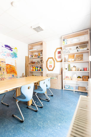 Im Atelier der Kita können die Kinder gestalterisch und forschend tätig werden und mit unterschiedlichen Materialien arbeiten, um ihrer Kreativität Ausdruck zu verleihen. Das Ausstellen der Werke betont die Wertschätzung der Arbeit der Kinder. Die Altersheterogenität der Kita fördert das gemeinsame Miteinander und das Lernen von Rücksichtnahme gegenüber den Kleinen stärkt das Selbstbewusstsein und fördert die Selbständigkeit der „Großen“.